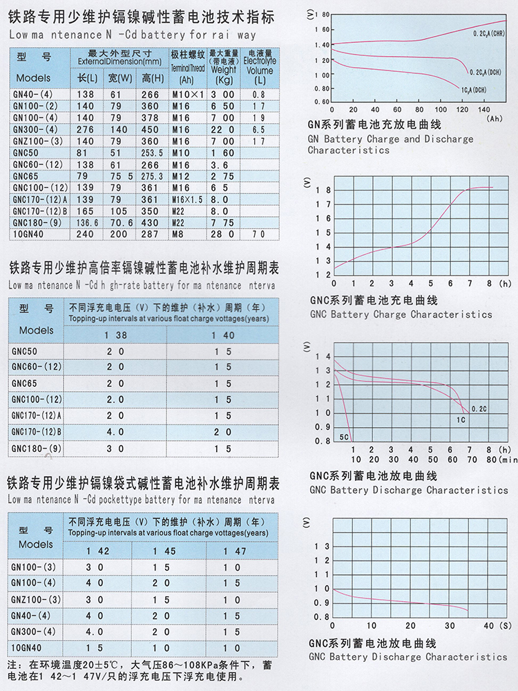 鐵路專用少維護(hù)鎘鎳堿性蓄電池采用了閥控式氣塞,使電池內(nèi)部保持一定的正壓力,防止電解液吸收二氧化碳及電解液中水的自然揮發(fā),保證了蓄電池在整個(gè)使用過(guò)程中不需要更換電解液。具有壽命長(zhǎng)、結(jié)構(gòu)堅(jiān)固、自放電小、耐過(guò)充過(guò)放電、使用溫度范圍廣、可靠性高等優(yōu)點(diǎn)。蓄電池在不同電壓下浮充使用時(shí),1~4年不需維護(hù)(視浮充電壓而定)