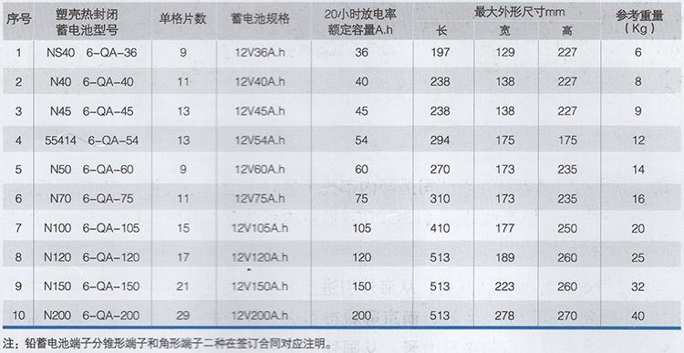 全塑殼熱封閉蓄電池適應(yīng)于各種汽車、船舶及其他內(nèi)燃機的起動、點火和照明,還適用于家庭電器、風力和太陽能等發(fā)電的儲蓄。這種蓄電池的正極板管式,負極板為涂膏式,還有正負極板都為涂膏式,采用纖維袋式隔板及塑料膠殼。電池槽與蓋之間的封口是專用設(shè)備熱封。●起動用鉛酸蓄電池基本參數(shù)及外形尺寸
